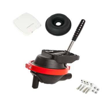 The Whale® Compac 50 is a hand-operated flush pump designed specifically for recirculating portable toilets. Its compact, low-profile design allows for easy installation in confined spaces, making it ideal for portable sanitation units. The pump features a nitrile diaphragm, ensuring durability and chemical resistance when used with common toilet additives. It comes equipped with 1-inch inlet and outlet ports - one straight and one at a 90° angle - for flexible hose connections. The package includes a mounting deck plate, fixing screws, and a rubber gaiter to seal around the handle, facilitating straightforward installation and maintenance. Â