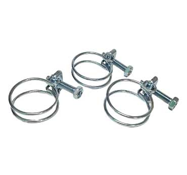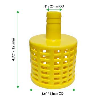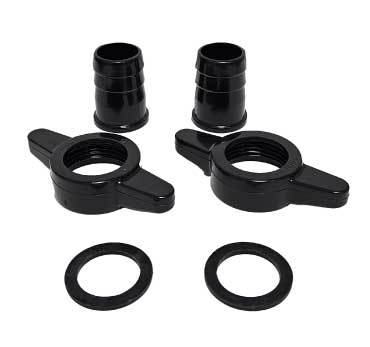 The pump is supplied with standard 1" hose connections (threaded ends to connect to the pump and with barbed ends to attach to your water hose) and a water filter.