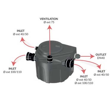 This unit includes a pre-mounted discharge kit with pipework (DN40mm ID / 50mm OD) that exits near the top of the chamber. Additional pipework can be easily connected to direct the waste to its final destination.