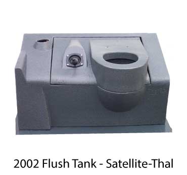 Flush Flap Only - Satellite Thal-Mondo-2002 Flush Tank. No balance weight required. OEM part number 19847. Hinges from the base of the toilet bowl and swings shut to hide the contents of the waste tank. The Thal-Mondo 2002 flush tank sold from 2002 until 2008.