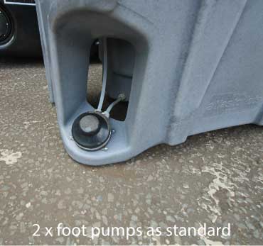 The fresh water chamber has a capacity of 22 gallons (100 litres) and the grey water chamber is deliberately-oversized to capture up to 24 gallons (110 litres). The grey water chamber can be drained (if required) by undoing a ½" brass plug at its base. Otherwise, a portable toilet operator will generally provide the all-round service of fresh water supply and grey water removal.